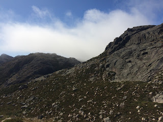 Este trilho tem início junto à Portela de Leonte, seguindo pela estrada até à ponte do rio Maceira, aí tomamos o caminho à direita e subimos a encosta, percorrendo, em parte, o mesmo percurso que efectuámos nos trilhos Leonte, Pé de Medela, Messe, Conho, Vidoal e Trilho de Leonte às Albas pelo Pé de Medela. Rapidamente chegamos ao pequeno prado do curral de Maceira, a partir daqui a inclinação acentua-se e seguimos tendo por companhia o Pé de Cabril. do outro lado da encosta, que vamos observando sob diferentes perspetivas. Apesar do sol radioso com que iniciámos o trilho, à medida que subíamos víamos ao longe um extenso banco de nuvens que se ia aproximando. Quando chegámos ao prado do curral de Tábuas o manto de nuvens aproximava-se já rapidamente do Pé de Cabril. Daqui seguimos pelo ribeiro do Porto das Vacas em direcção aos prados da Messe, apreciámos mais uma vez este belíssimo prado, abastecemos de água e decidimos continuar em direcção ao nosso objectivo inicial, as Porta Ruivas. Mas à medida que caminhávamos víamos que um manto de nevoeiro ia envolvendo rapidamente a paisagem atrás de nós, se prosseguíssemos com este nevoeiro acabaríamos por não desfrutar das magnificas vistas de Porta Ruivas pelo que optámos por regressar, indo agora em direcção ao magnífico prado do Conho onde aproveitámos para almoçar. Em boa hora o fizemos, já que quando terminámos de almoçar um denso manto de nevoeiro se tinha abatido sobre nós.
